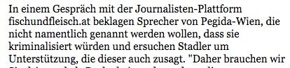 Deshalb veröffentlichte man, unter dem Nutzer „fischundfleisch“ einen Beitrag mit dem Titel „Pegida Wien holt Ewald Stadler als Rechtsbeistand“. Pegida Wien ist der Ableger des deutschen Pendants, Ewald Stadler ehemaliger FPÖ- und BZÖ-Politiker, ehemaliger EU-Parlamentarier und nun Parteichef der eigens gegründeten Partei „REKOS“. Inhalt dieses Beitrages war ein Transkript eines Gesprächs, welches offenbar so zwischen Ewald Stadler und zwei anonymen Pegida-Vertretern stattgefunden hat. Das war das eine, andererseits hat sich die Plattform in diesem Artikel erstmals als „Journalisten-Plattform“ bezeichnet.